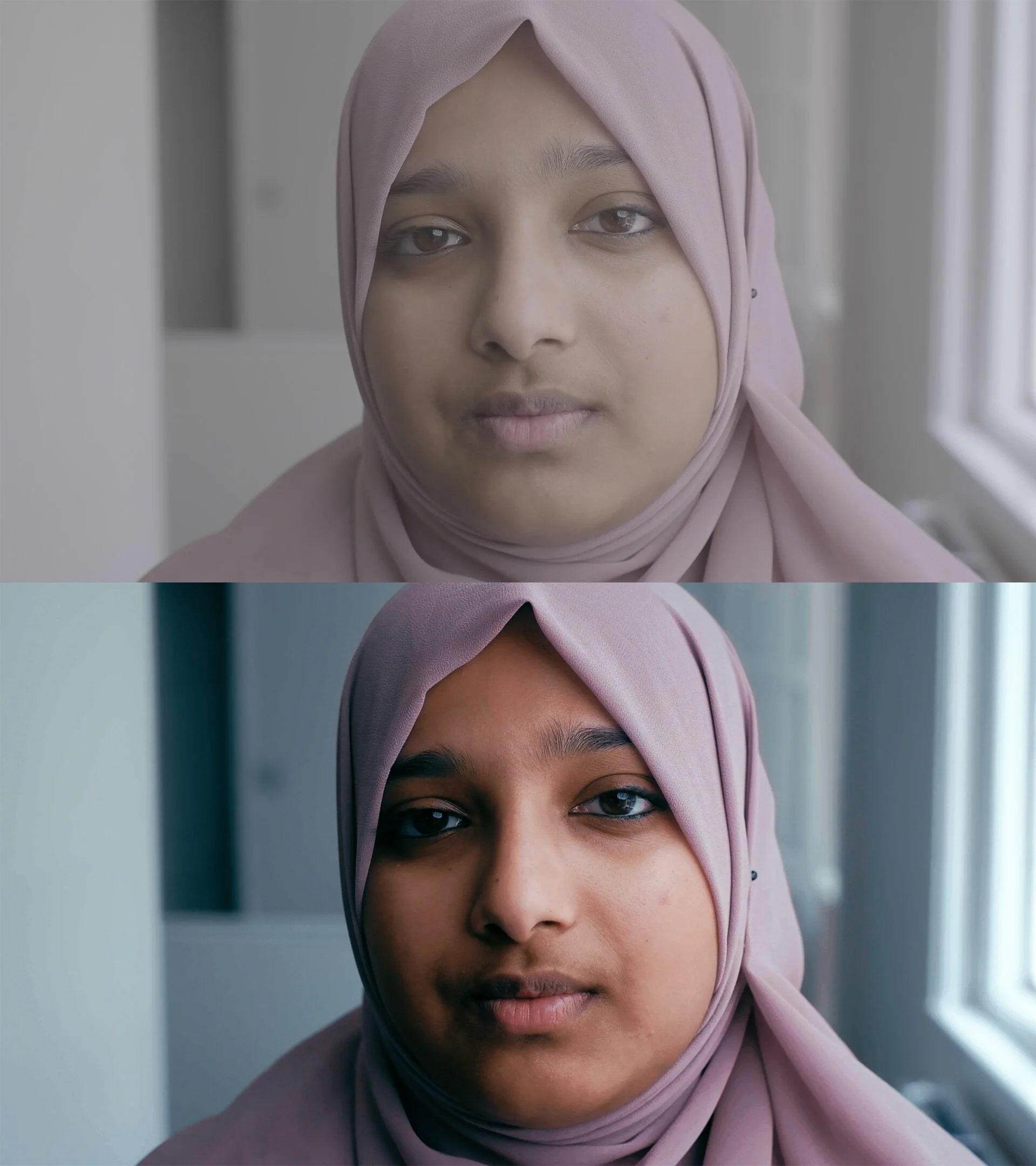 When we were filming, I already knew what colour scheme I’ll want to work with. I really wanted to create a cinematic look, not just to apply colour correction. I played with the blues in the highlights and whites in the background. Then I made sure that the skin tones align nicely in this blue context. Below you can see the screenshots of the clips before and after colour grading.